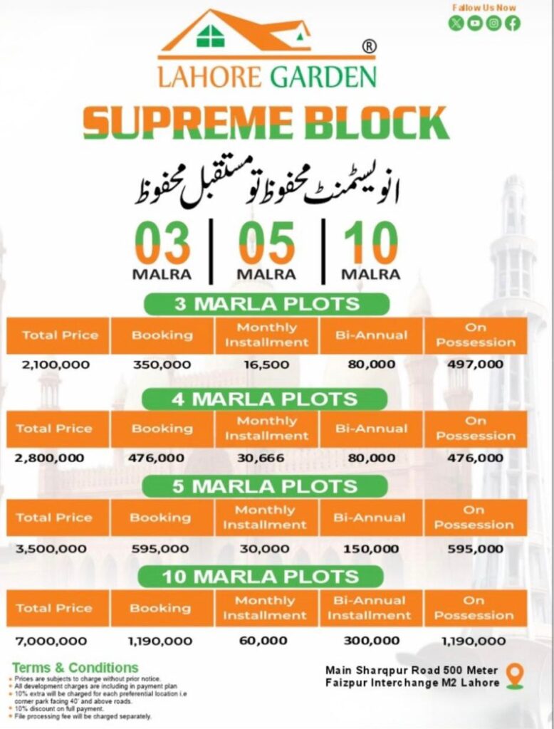 You would feel contended and proud at your choice after deciding to live in this community. Here residential and commercial both plots are available in different sizes. Either you are a business initiator, an investor or a person in search of an ideal living place, Lahore Gardens Society appeals to all.